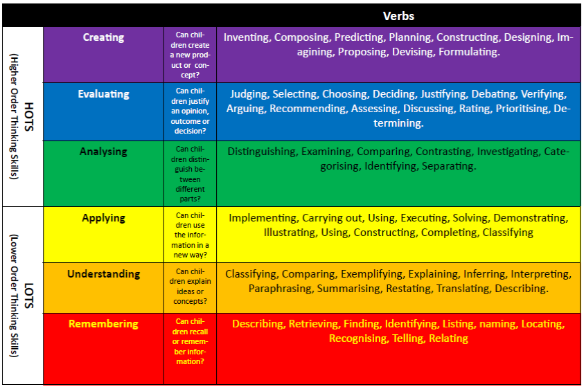 The HOTS and the LOTS are divided into 3 further sub-groups as illustrated below. We use these to help us to differentiate learning in lots of curriculum areas, including maths.